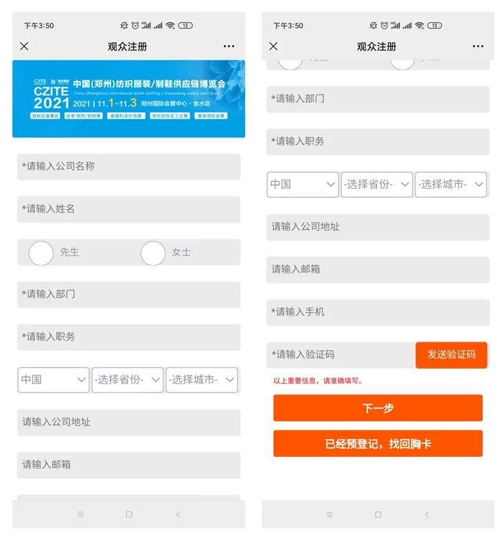 方法2:关注「郑州纺博会CZITE」官方公众号。找到底部菜单栏「参观参展」-「注册参观」。