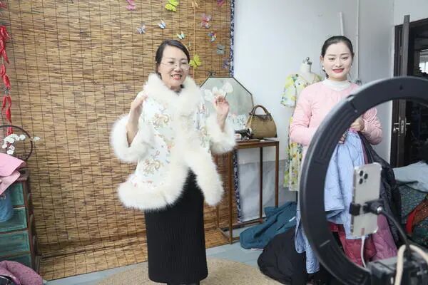 在车间左边的一排小隔间内,可以看到,屋内灯火通明,“家人们,您看这款,超显瘦,黑色优雅、白色俏皮......”聚光灯下,几个小姐妹们正穿着自家的中式唐装在镜头前摆着POSE,吆喝声不绝于耳。