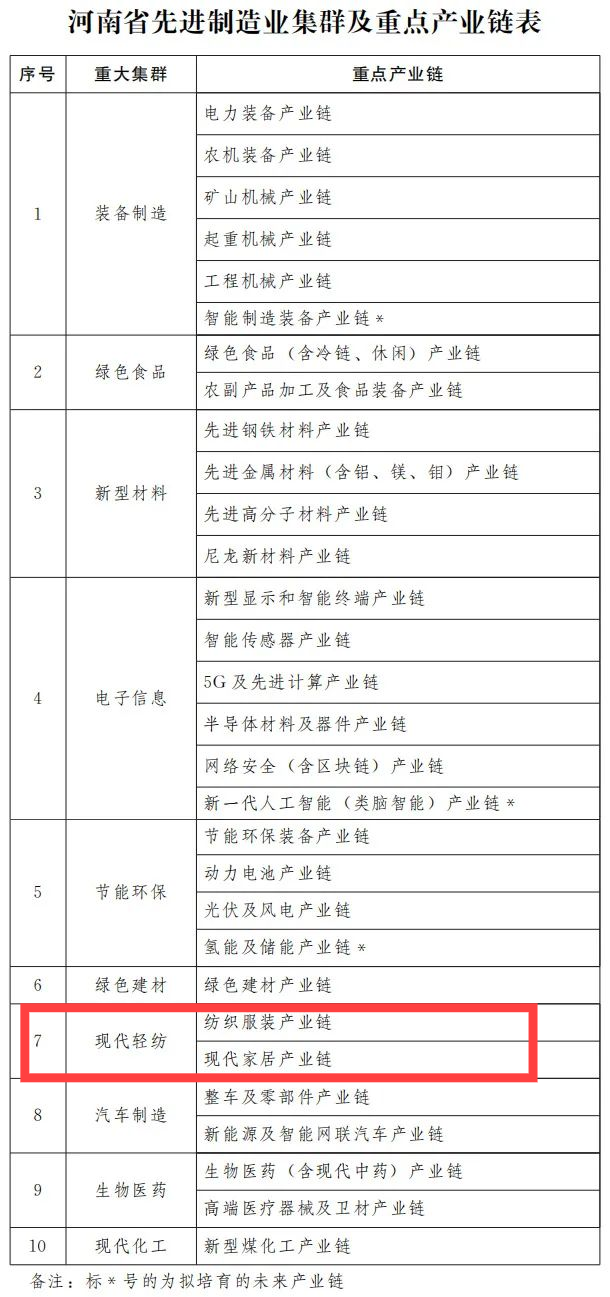 为贯彻落实党中央、国务院关于发展先进制造业集群的决策部署,大力实施“集群强链”提升专项,培育先进制造业集群,提升产业链现代化水平,结合我省实际,制定本方案。(一)指导思想。以习近平新时代中国特色社会主义思想为指导,把握新时代中部地区高质量发展、黄河流域生态保护和高质量发展等战略机遇,坚持把制造业高质量发展作为主攻方向,突出“项目为王”导向,围绕统筹传统产业转型升级、新兴产业重点培育、未来产业谋篇布局,以提升集群能级、创新能力、链条水平和优化生态为目标,实施创新强链、数字融链、转型延链、多元稳链、招商补链、生态畅链“六大行动”,努力实现产业链、创新链、供应链、要素链、制度链深度耦合,打好产业基础高级化和产业链现代化攻坚战,推动产业由集聚发展向集群发展全面跃升,形成一批万亿级先进制造业集群和千亿级现代化产业链,为制造强省建设提供坚实支撑。(二)主要目标。到2025年,实现“三提升一优化”目标:——集群能级提升。重点培育10个重大先进制造业集群,其中万亿级7个、5000亿级3个,力争形成2—3个世界级先进制造业集群。重点打造30个左右千亿级现代化产业链,先导布局3—5个未来产业链。——创新能力提升。围绕重点集群和千亿级产业链,统筹布局30个制造业创新中心、技术创新中心或创新联合体,实施300个重大科技创新项目,推广应用3000个以上集群创新产品,集群协同创新能力显著增强。——链条水平提升。集群产业链数字化、网络化、智能化、绿色化、服务化、安全化达到全国一流水平;供应链与“双循环”新发展格局相适配,基本形成自主可控、安全高效、稳固多元的供应体系。——生态持续优化。集群内大中小企业实现融通共赢发展,产业链与创新链、供应链、要素链、制度链高效衔接、深度耦合、协同一体,集群和链条要素供给保障更加有力,集群营商环境达到全国一流水平。按照“一群多链、聚链成群”的原则,围绕先进制造业体系建设,加快培育万亿级战略支柱产业集群、千亿级现代化产业链。(一)装备制造集群。做强电力装备、农机装备、矿山机械、起重机械、工程机械等千亿级优势产业链,做大盾构装备、轨道交通装备、智能机器人、数控机床、3D打印、无人机等新兴产业链。到2025年,建成具有重要世界影响力的万亿级装备制造业集群。(责任单位:省工业和信息化厅、发展改革委、科技厅)(二)绿色食品集群。做强冷链食品、休闲食品、农副产品加工及食品装备等千亿级优势产业链,提升烟草、酒业产业链现代化水平,发展“药食同源”产业链,推动食品制造由“国人厨房”向“世界餐桌”转变。到2025年,建成具有世界影响力的万亿级现代食品集群。(责任单位:省工业和信息化厅、农业农村厅、发展改革委、科技厅、河南中烟公司)(三)新型材料集群。打造先进钢铁材料、新型铝合金、钨钼钛合金、尼龙新材料、新型耐材、超硬材料等千亿级产业链,壮大电子材料、硅碳新材料、镁合金、可降解材料等产业链,提升改造铅锌、银铜、黄金等传统产业链,培育碳基新材料、特种金属材料、第三代半导体材料、先进功能材料等未来新材料产业链。推动由基础材料大省向先进材料强省跨越。到2025年,建成具有世界影响力的万亿级新型材料产业集群。(责任单位:省工业和信息化厅、发展改革委、科技厅)(四)电子信息集群。壮大新型显示和智能终端、智能传感器、网络安全、5G等千亿级产业链,加快培育集成电路、光通信、汽车电子等产业链,积极布局新一代人工智能(类脑智能)、量子信息、区块链、卫星及北斗应用等未来产业链。到2025年,建成全国重要的万亿级电子信息产业集群。(责任单位:省工业和信息化厅、发展改革委、科技厅)(五)节能环保集群。做强节能环保装备、动力电池、光伏、风电等千亿级产业链,推动节能环保服务与资源综合利用产业发展,加快培育氢能与储能未来产业链。加快由节能环保产品消费大省向节能环保产业强省转型。到2025年,建成全国重要的万亿级节能环保装备及服务产业集群。(责任单位:省工业和信息化厅、发展改革委、科技厅、生态环境厅)(六)现代轻纺集群。培育纺织服装、现代家居及家电等千亿级产业链,提升轻纺家居品牌化、高端化水平和创意设计能力,提升壮大智能家电产业链。到2025年,建成全国重要的万亿级轻纺家居产业集群。(责任单位:省工业和信息化厅、发展改革委、科技厅)(七)绿色建材集群。培育新型玻璃及墙材、装配式建筑等千亿级产业链,加快水泥、普通玻璃等传统建材产业链转型升级,着力建设一批综合性绿色建材基地。到2025年,建成全国重要的万亿级绿色建材产业集群。(责任单位:省工业和信息化厅、发展改革委、住房城乡建设厅、生态环境厅)(八)汽车制造集群。培育整车及零部件、新能源及智能网联汽车等千亿级产业链,积极推动燃料电池汽车示范应用城市群建设。到2025年,集群规模达到5000亿级,成为全国新能源及智能网联汽车发展高地。(责任单位:省工业和信息化厅、发展改革委、科技厅)(九)生物医药集群。培育生物医药、现代中药、高端医疗器械及卫材等千亿级产业链,推动生物医药产业“由点到面”全方位提升。到2025年,集群规模达到5000亿级,成为全国重要的生物医药产业基地。(