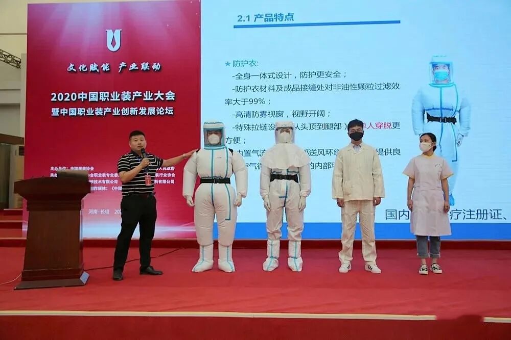 据了解,这种防护服由防护衣、呼吸管以及过滤送风装置组成,能调节服装内部温度,可以控制在26-29℃之间送的风,还能蒸发汗水,衣物不会湿透贴在身上,而且医护人员浑身被空气笼罩,没有压迫眩晕感和呼吸困难感,可谓是“防暑神器”。目前,湖北武汉、海南三亚以及河南多地的医护人员都穿上了“大白”防护服!其实,早在一年前,“大白”医用正压防护服就在首届中国·长垣职业装产业大会上亮相。驼人集团营销副总裁常省委通过防护服的现场展示,分析了医用正压防护服产品研究及应用。