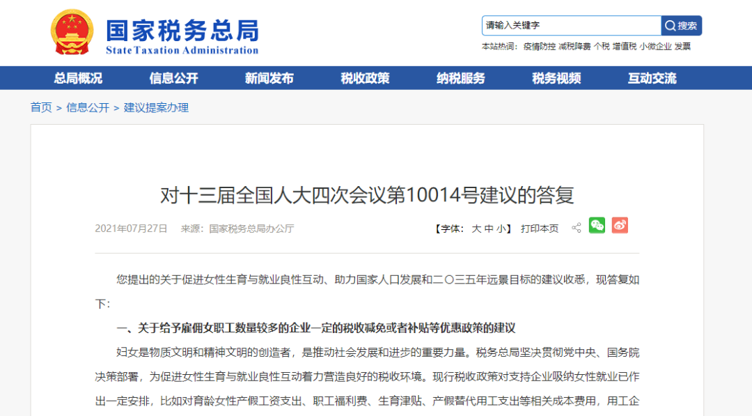 / 国家税务总局回应“给雇佣女职工较多的企业减税”:积极研究储备政策