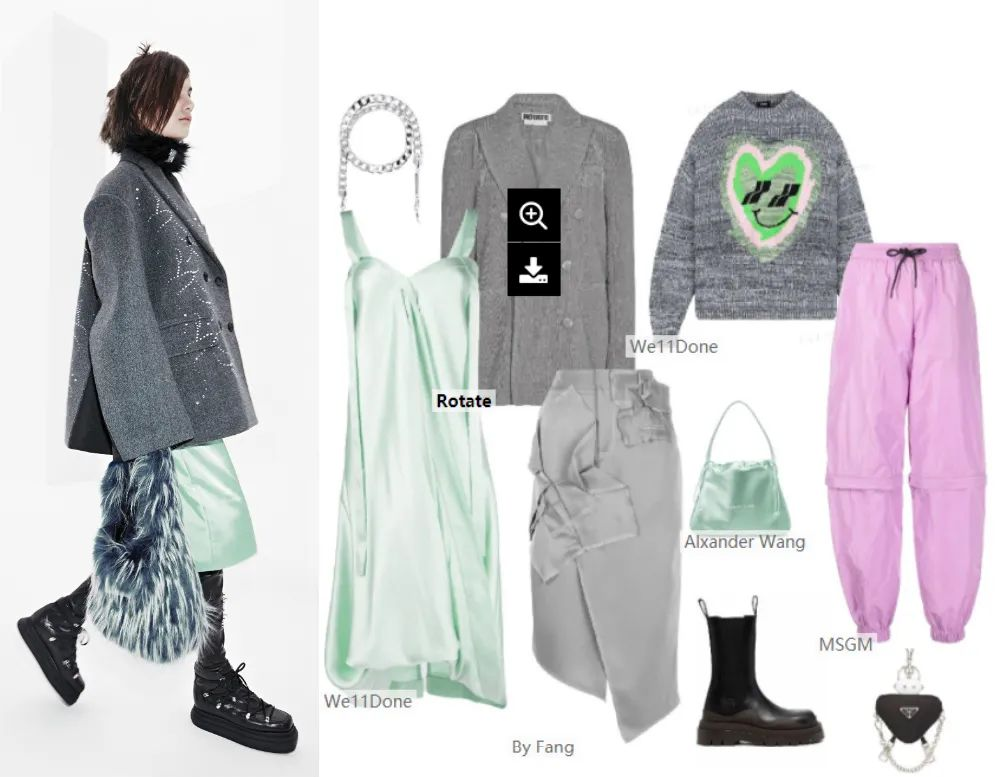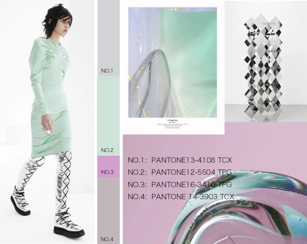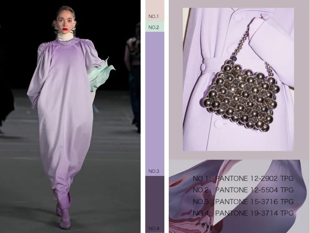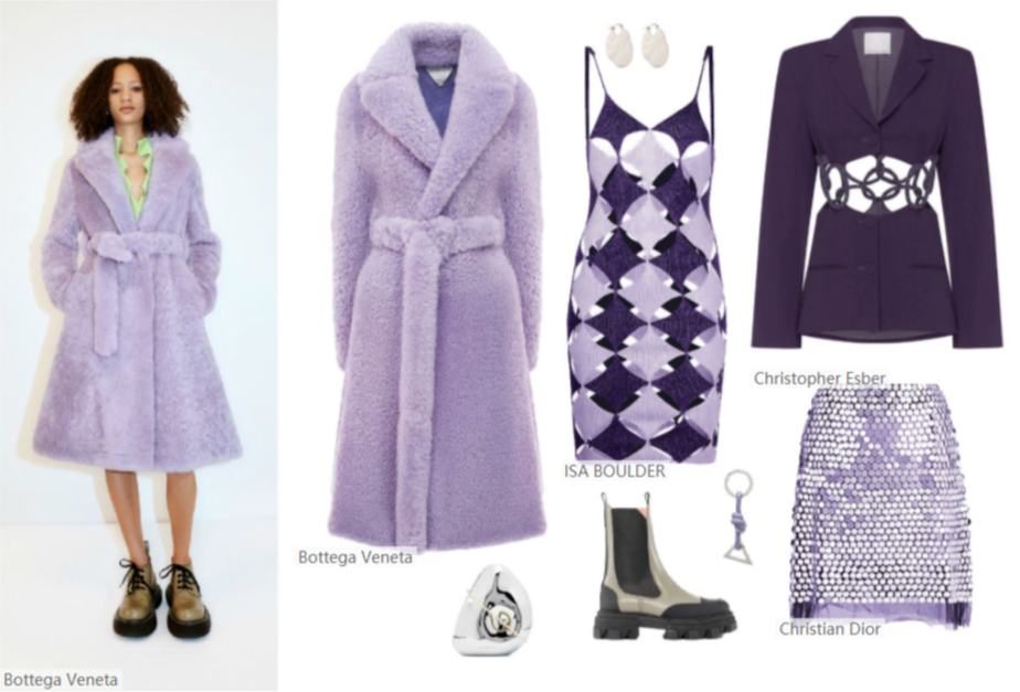 同色系渐变以及数字色的多层次的表现,展现出色彩的流动性。本组色彩以两个不同层次的紫色契合当下双色同色系搭配的趋势。以数字玫紫搭配宇宙紫为主色调,加入湖绿作为点缀。未来金属在辅料、配件中的应用提升时髦度,增加摩登感。