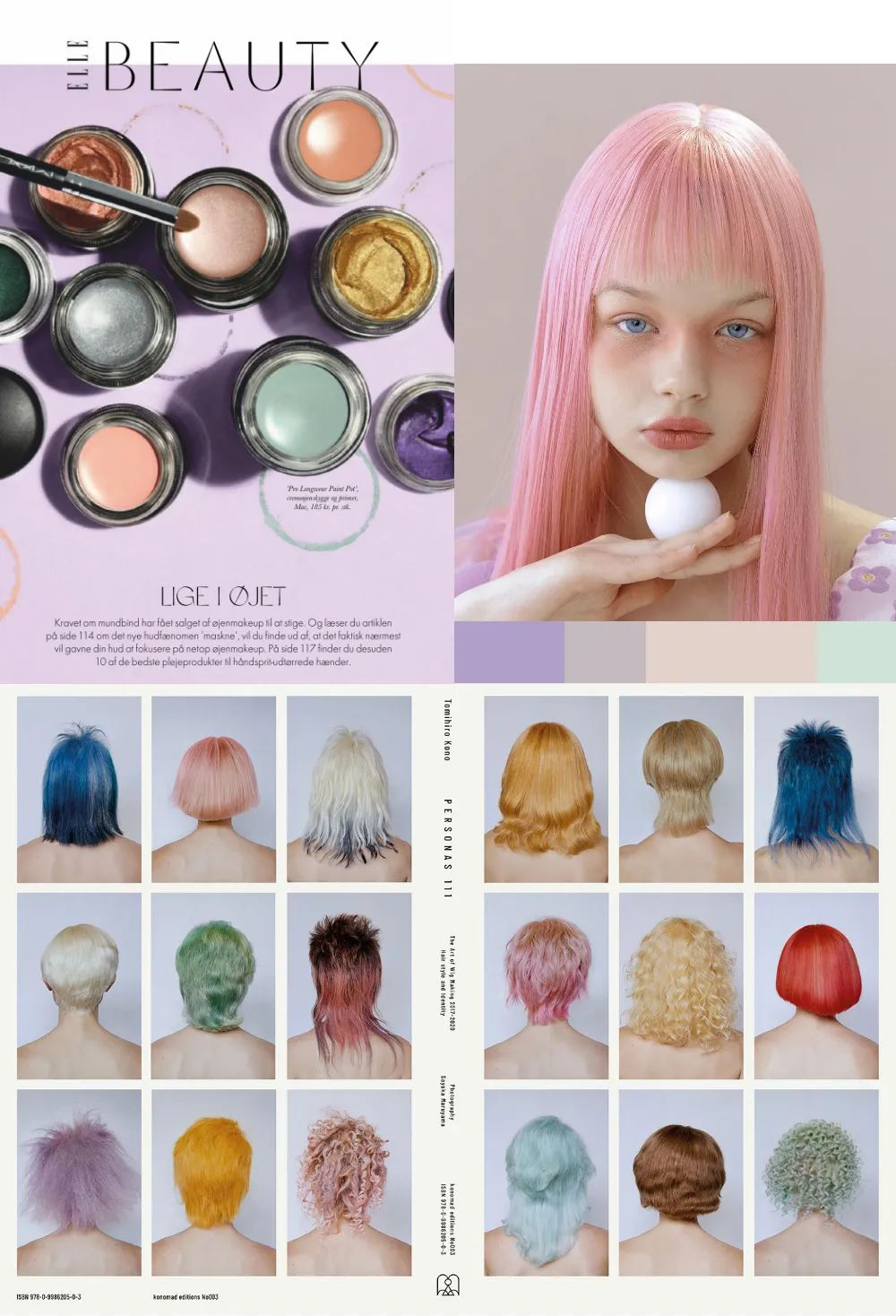 数字第六感所表达的数字触觉和色彩在彩妆中更受Gen Z消费者欢迎。我们能从INS、小红书及主流杂志、彩妆艺术家的发布看到该组色相在未来少女市场的重要性。日本假发艺术家TOMIHIRO KONO的假发系列作品对漂染发色方向提供了重要方向。彩妆方面高明度的淡彩彩妆所打造的甜美厌世妆容来打造生化“娃娃”妆容。