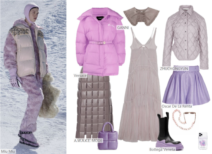 参考Miu Miu的配色方案,以柔和中性色为主色调,搭配流行粉色系,整组色体现了超强的实用性。针织、皮革的碰撞让色彩所折射出的色相、光泽更具搭配魅力。