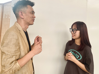 左:天津工业大学 服装设计与工程专业企业硕士导师、天津胜美科技有限公司设计总监李衡。记者:“李总,据悉此次大秀的11个系列均来自于“匠心青春梦 • 大学生职场装设计技能大赛”,作为大赛的评委以及天津工业大学服装设计与工程专业企业硕士导师,您能为我们介绍一下“匠心青春梦 • 大学生职场装设计技能大赛”吗?”