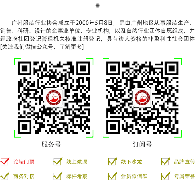 [温馨提示] 文章来源于广州服装行业协会公众号,转载注明原文出处,此文观点与查生意无关,理性阅读,版权属于原作者若无意侵犯媒体或个人知识产权,请联系我们,本站将在第一时间删掉 ,查生意仅提供信息存储空间服务。