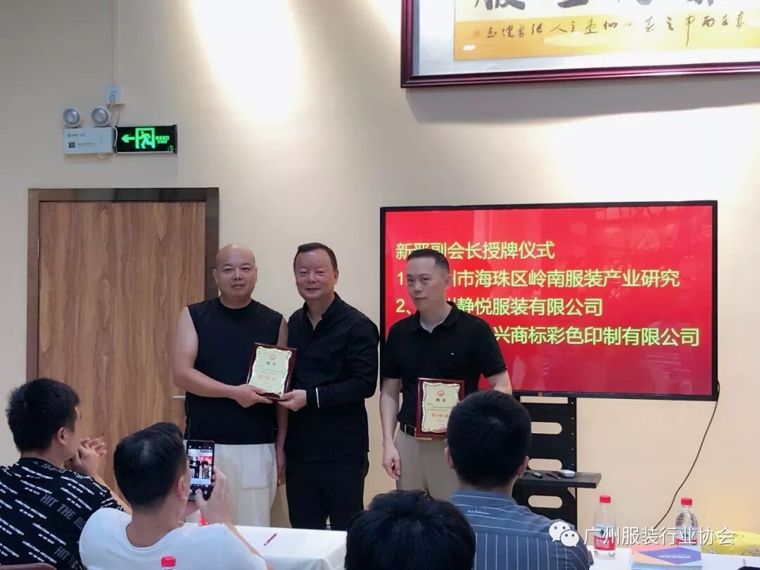 我协会借本次大会,举办授牌仪式,为几位新晋副会长颁发牌匾,让参会人员一起见证协会的精彩。本次授牌新晋副会长单位有:广州市海珠区岭南服装产业研究、广州静悦服装有限公司、广州市富兴商标彩色印制有限公司。协会因他们的加入而更加精彩!
