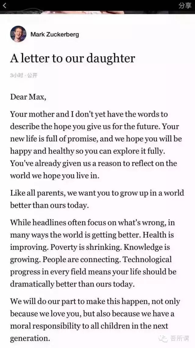 美国当地时间昨天,Facebook的创始人马克·扎克伯格喜得千金之后,马上将自己持有的价值450亿美元的99%股份捐出去,450亿是多少钱?相当于约2878亿人民币的巨额财富撒向世界了。一时间小马发布这一则消息之后,全世界就开始沸腾起来。这可是当然了,因为有个人突然之间向世界撒下白花花的银子。为什么小马要做出如此大出血的行动?他是为了让女儿以后可以健康成长,从此什么国民岳父国民啥啥的全都失去了吸引力,小马瞬间升格为“全球岳父”,岳父大人还专门写了一封信给女儿,以下是号称人类宣言的信的内容。你的到来,让你老妈和我对今后的日子无比憧憬。我们希望你快乐、健康地长大,去迎接生命中所有的温暖和希望。你的到来,也让我们重新认识、思考这个你将赖以存在的世界。