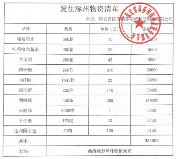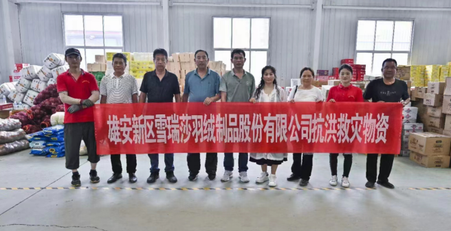 保定雪瑞莎羽绒制品股份有限公司积极响应河北省纺织与服装行业协会党支部的号召,在涿州遭受洪涝灾害、严重影响人民群众的生活和生命安全的第一时间,雪瑞莎集团勇于担当社会责任,紧急调配灾区居民生活日用物资,火速发往涿州,以解群众基本生活困难之急。