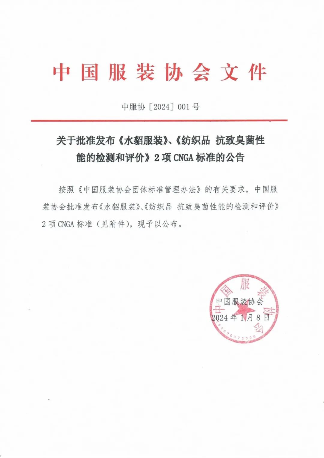 按照《中国服装协会团体标准管理办法》的有关要求,中国服装协会批准发布《水貂服装》、《纺织品 抗致臭菌性能的检测和评价》2项CNGA标准(见附件),现予以公布。