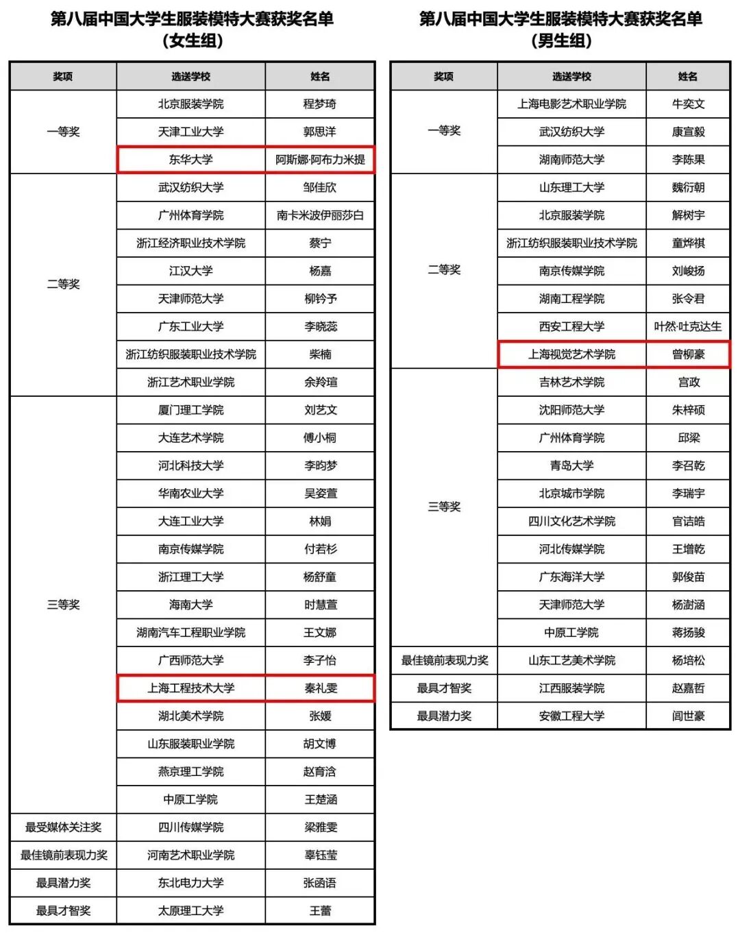 经过角逐,最终牛奕文(上海电影艺术职业学院)、康宣毅(武汉纺织大学)、李陈果(湖南师范大学)摘得男模组一等奖;曾柳豪(上海视觉艺术学院)摘得男模组二等奖;程梦琦(北京服装学院)、郭思洋(天津工业大学)、阿斯娜·阿布力米提(东华大学)斩获女模组一等奖;秦礼雯(上海工程技术大学)摘得女模组三等奖。
