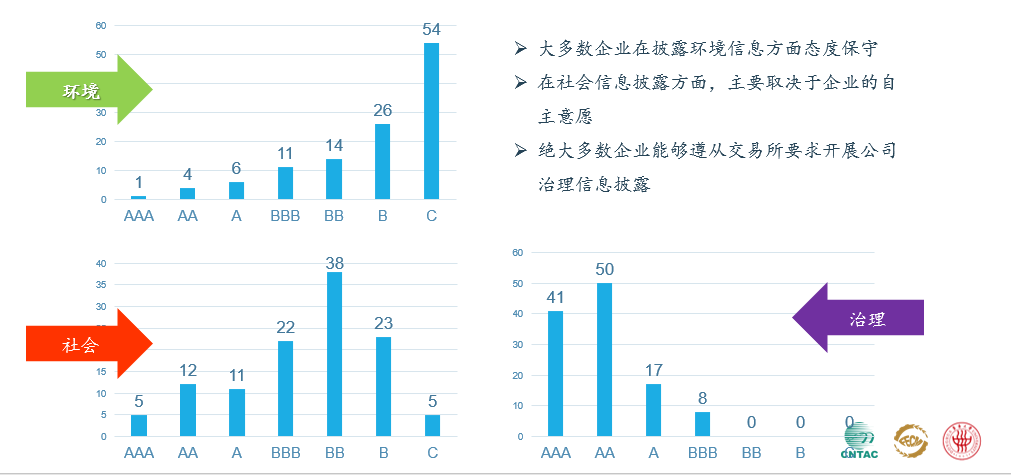 从本次上市企业在环境信息、社会信息与公司治理各项信息披露得分统计结果中,我们可以清晰地看到大多数企业在披露环境信息方面态度保守;在社会信息披露方面,主要取决于企业的自主意愿;绝大多数企业能够遵从交易所要求开展公司治理信息披露。
