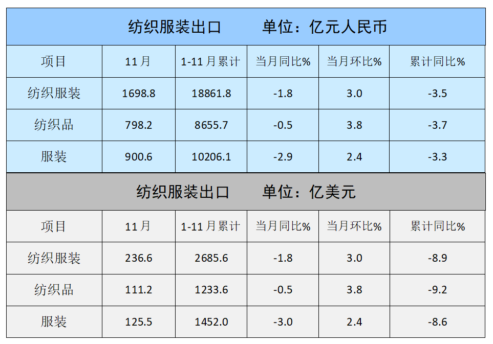 / 数据|11月纺织服装出口降幅进一步收窄,整体呈现回稳态势