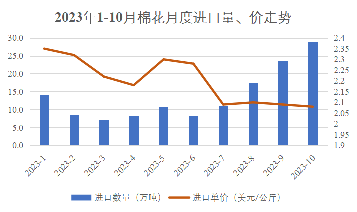 10月,我国进口棉花28.8万吨,环比增长22%,同比增长122%。其中美棉进口量仍居首位,占比为37%;巴西排第二,占比27.5%;澳大利亚排第三,占比15.8%。进口均价每吨2080美元,同比下降32.3%,环比下降0.5%。1-10月,我国累计进口棉花138.5万吨,同比下降12.7%;进口均价2170美元/吨,下降18.7%。