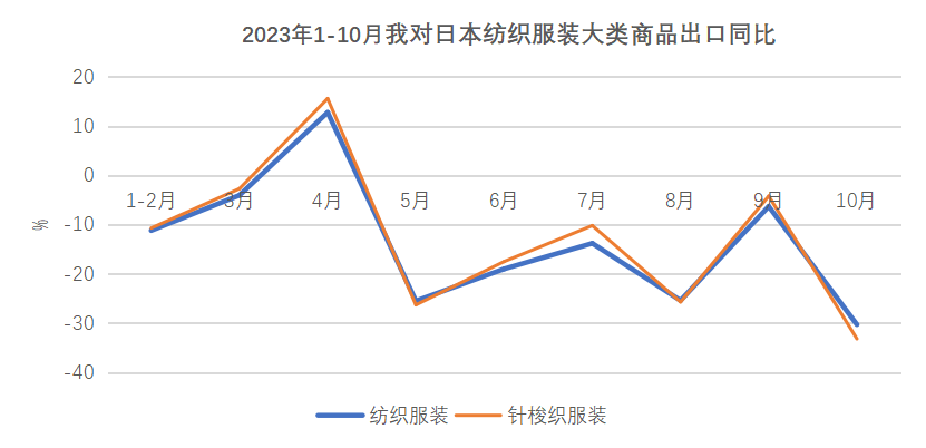 日本是本月我国纺织服装出口下降最多的市场。日本总务省调查显示,由于通货膨胀持续,工薪家庭实际收入下降,日本8月实际家庭消费连续6个月同比下滑,对纺织服装需求下降。10月,我对日出口纺织服装14亿美元,同比下降30.3%,降幅经上月收窄至6%后再次扩大。大类商品针梭织服装对日出口8.9亿美元,下降33.2%,其中出口量下降25.8%。1-10月,我对日出口纺织品和服装145.9亿美元,同比下降14.4%;其中,出口针梭织服装95.6亿美元,同比下降13.7%。