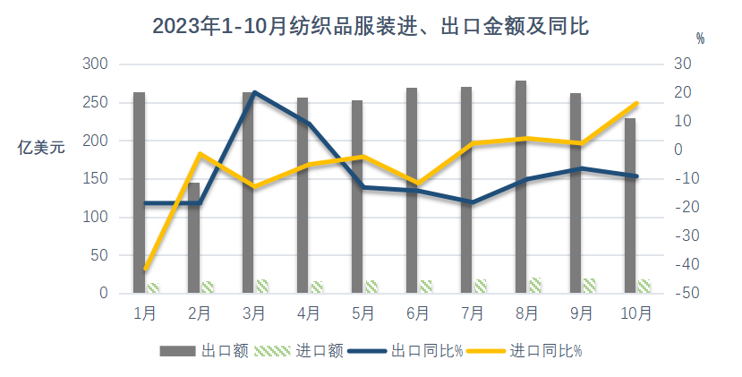 10月,纺织品服装贸易额248.6亿美元,同比下降5.7%,其中出口229.7亿美元,下降8.4%,进口18.9亿美元,增长16.3%,当月贸易顺差210.8亿美元,下降8.8%。