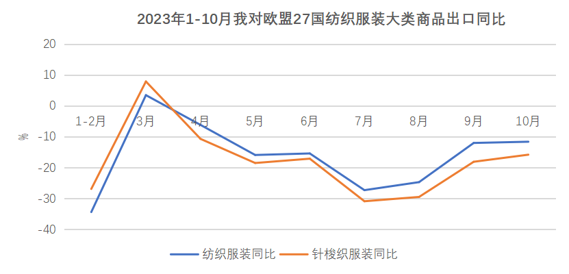 近日,欧盟委员会预测2023年欧元区经济增长率仅为0.6%,此外,对明年的经济展望也从9月份的1.3%下调为1.2%。高物价导致消费心理萎缩,加之欧洲央行的高利率导致贷款和投资意愿下降,使欧元区经济复苏失去动能。我对欧盟出口延续同比、环比双下跌的跌势。10月,我对欧盟出口纺织服装25.4亿美元,同比下降11.6%,其中对德国出口下降18.2%。重点商品针梭织服装本月出口量价齐跌,出口额14.9亿美元,下降15.8%,出口量下降8.4%。1-10月,我对欧盟出口纺织品服装322亿美元,同比下降19.6%;其中出口针梭织服装196.2亿美元,下降22.3%。