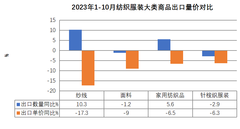 从1-10月数据看,纺织品累计出口额1126.3亿美元,同比下降9.9%;服装出口额1334.8亿美元,同比下降8.8%。四大类商品中,纱线和面料出口额分别下降8.8%%和10.1%;家用纺织品和针梭织服装出口额分别下降1.3%和9%。出口数量方面,纱线和家用纺织品分别上涨10.3%和5.6%,面料和针梭织服装则分别下降1.2%和2.9%。出口价格方面,四大类商品全部下降,其中纱线跌幅最大,为17.3%,面料、家纺和针梭织服装则分别下降9%、6.5%和6.3%。