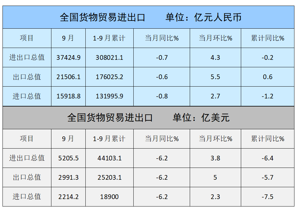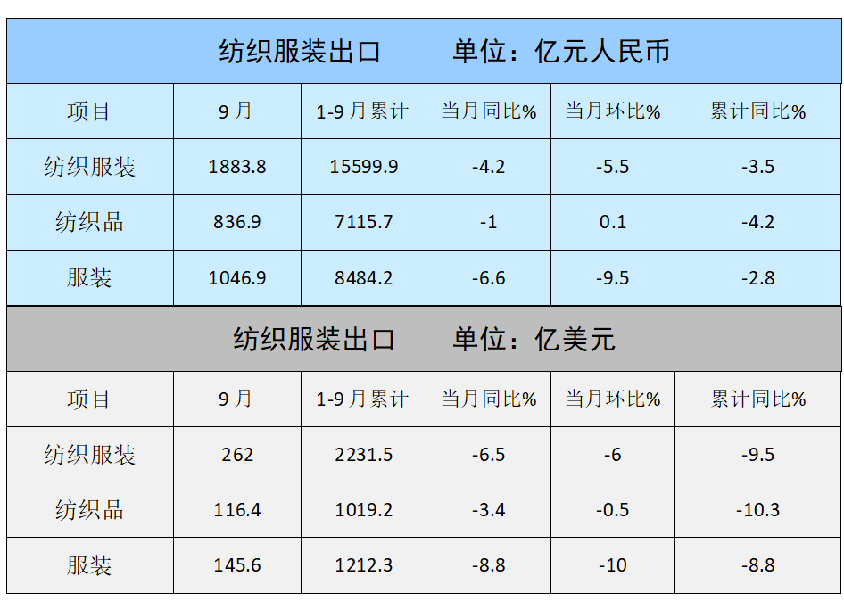 9月,纺织服装出口262亿美元,下降6.5%,环比下降6%,其中纺织品出口116.4亿美元,下降3.4%,环比下降0.5%,服装出口145.6亿美元,下降8.8%,环比下降10%。