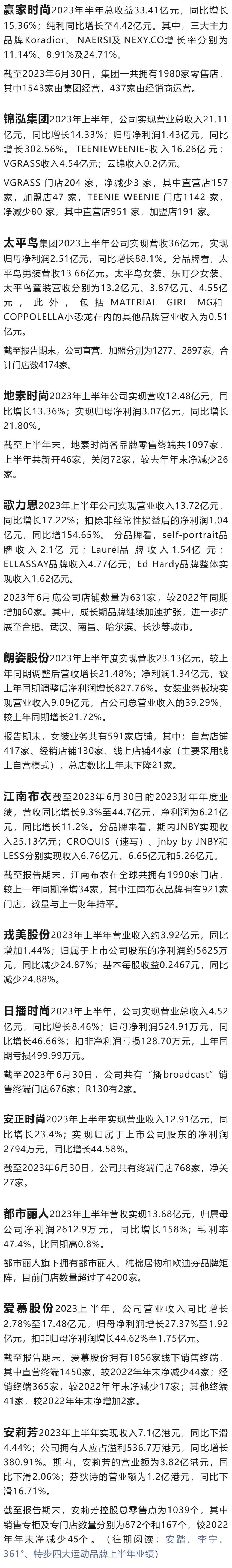 2023上半年13家中国女装公司业绩与门店数量汇总
