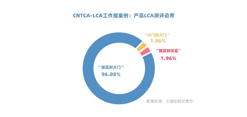 根据CNTAC-LCA工作组统计,目前绝大部分(96.08%)产品的测评边界为“摇篮到大门(Cradle-to-Gate)”,对于纺织品即从“纤维到成品”,1.96%的产品测评边界为“摇篮到坟墓(Cradle-to-Grave)”,1.96%的产品测评边界为“大门到大门(Gate-to-Gate)”。