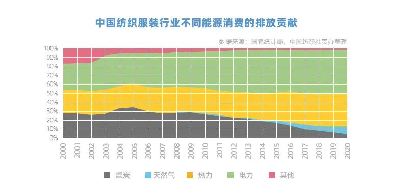 从能源结构来看,中国纺织服装行业不断优化能源结构,推进行业能源使用的低碳转型。中国纺织服装行业排放绝大部分来自能源使用(主要是电力和蒸汽),到2020年,“煤改气”“煤改电”取得显著进展,行业煤炭消耗占比从30%显著下降至低于10%,电气化程度不断提高。
