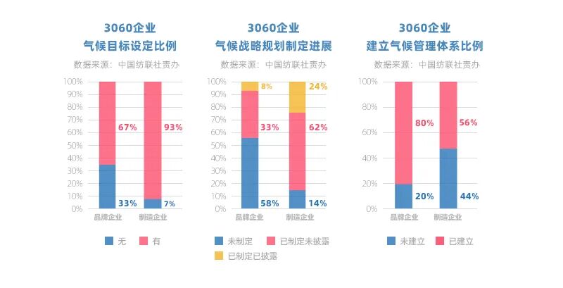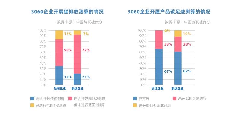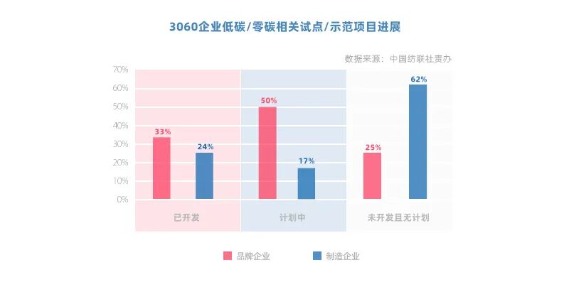 随着国家推动并建立绿色低碳相关工厂与产品等评价方法,纺织企业积极响应,锚定产业转型新机遇,3060企业已有27%完成开发低碳/零碳相关试点/示范项目。
