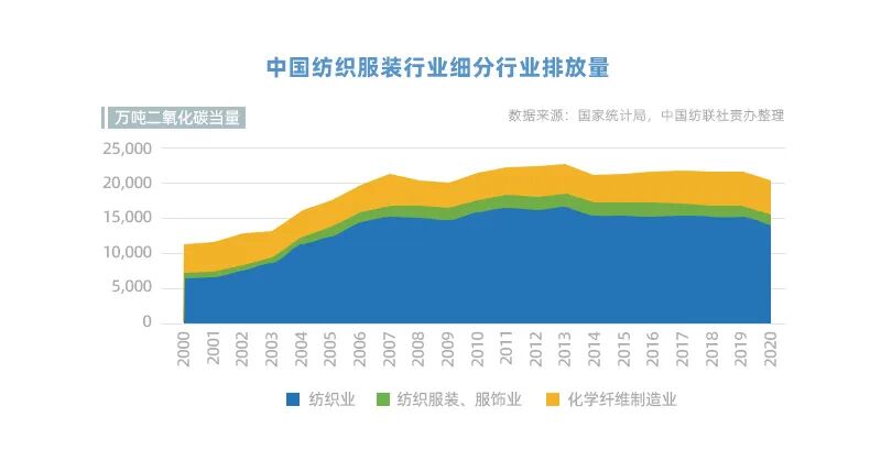 中国纺织服装行业温室气体排放自2000年起随着行业快速发展逐步上升,而后进入平稳期。2014年-2020年温室气体排放年均增速均低于0.5%。根据行业能源消费数据计算,2020年整个行业碳排放总量约为2.09亿吨。从排放来源看,中国纺织服装行业排放主要来自上游的材料制造加工端(包括纺织业和化学纤维制造业),纺织服装、服饰业占比低于10%。
