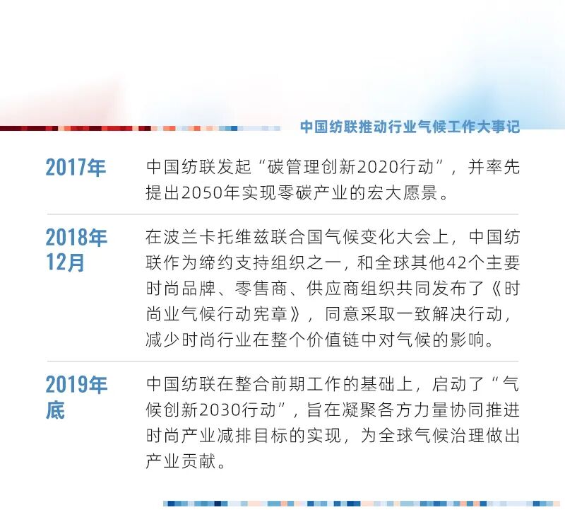 2020年9月22日中国宣布2030碳达峰2060碳中和战略目标,次日中国纺织工业联合会秋季联展全面推进气候创新行动,第一时间响应国家双碳战略目标。2021年6月1日中国纺织工业联合会正式启动了“中国时尚品牌气候创新碳中和加速计划”,简称“30·60碳中和加速计划”,目前21家品牌企业,42家制造企业陆续加入,支持绿色低碳技术研发推广和应用,全面推进可信低碳产品、支持可持续消费,共同推进行业气候行动。