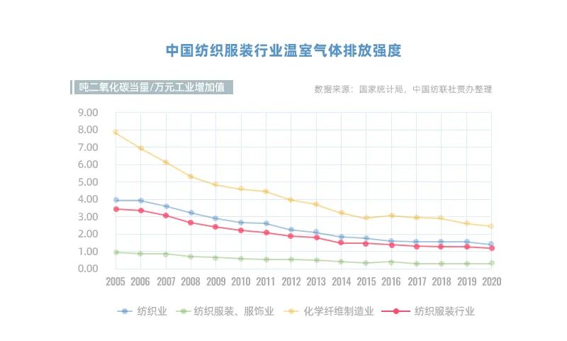 中国纺织服装行业年排放量大约在2.3亿吨左右,2020年排放总量约为2.09亿吨。行业排放量约占全国排放量的2%,占全国工业排放量的2.8%,因此与其他行业相比,纺织服装行业整体排放水平不高。而根据国际能源署统计,2019年全球纺织和皮革业排放在2.99亿吨左右,占全球排放量的0.6%,因此,中国作为全球纺织服装产业和消费大国,中国纺织服装行业肩负重大使命,其气候行动和进展将极大推动全球时尚行业绿色转型。