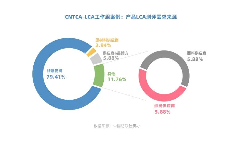 CNTAC-LCA工作组案例显示,终端品牌是产品碳足迹测评的主要推动者。79.41%的测评需求来源于品牌,2.94%来源于原材料供应商,11.76%来源于纱线、面料等中间产品供应商,还有剩余5.88%的测评由供应商和品牌方合作发起。