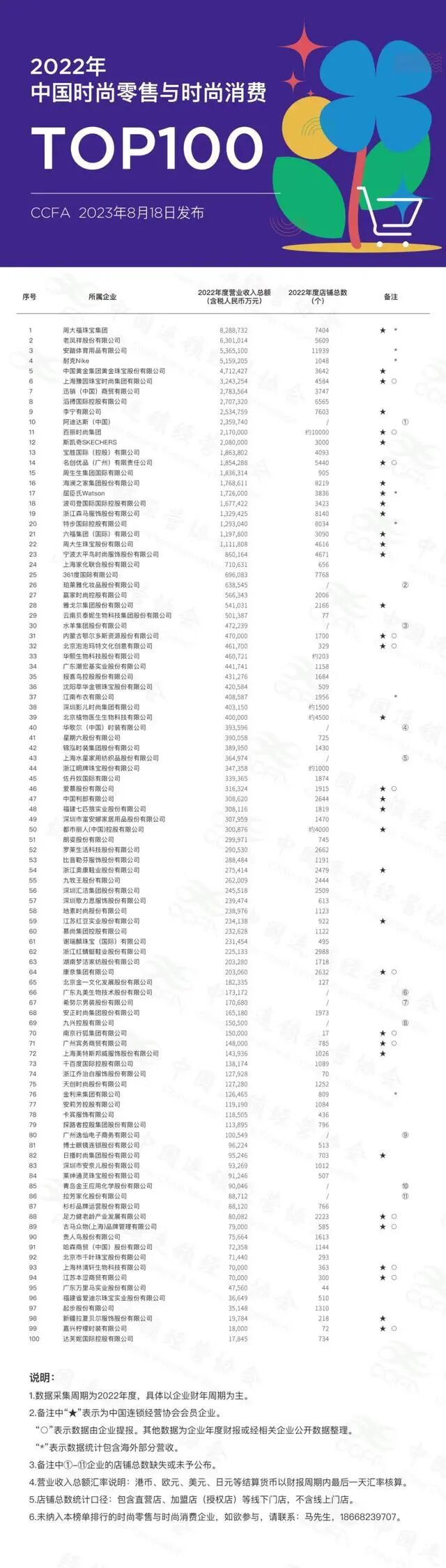 中国连锁经营协会(CCFA)发布了“2022年中国时尚零售与时尚消费TOP100”榜单。