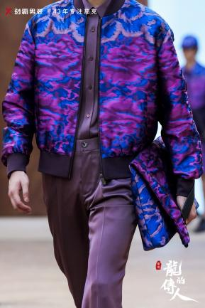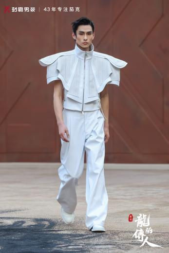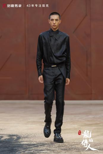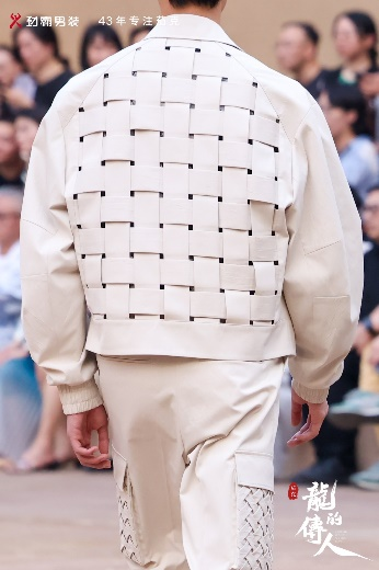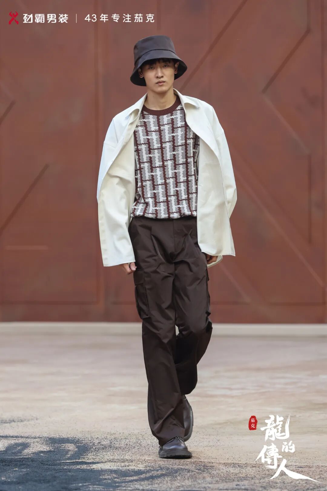 50套主牌劲霸男装秀款,9套童装little hong秀款,40套高端系列KB HONG秀款,从中式水墨写意花型,到中式建筑结构剪裁的解构融合;从劲竹的君子之气,到钧瓷的色彩意象;从交叠领、燕尾脊、中国山水等元素展现,到版型、色彩、花型,到神韵、意境等方面的审美表达;从印花、提花,到立体刺绣、针织镂空等匠造工艺;从高端质感面料、中式意蕴剪裁廓形,到中国色运用、立体编织手法,都能看到劲霸男装“中国符号”与“自我探寻”的交融之美,以针线交织起东方美学表达和多样化文明的时代新链接新对话。作为“文明孕生艺术,艺术滋养文明”的范例,劲霸男装撷取传统文化中的代表性元素,以中国茄克里的“东方语言”,让当代风尚对话历史文明,架构传统与现代、文化与生活、艺术与现实、品牌与人本。自1980两扇门板作裁床,缝制出第一件劲霸茄克,茄克逐渐替代西装、中山装、绿军装,成为中国创业创富族人群的重要表征。劲霸茄克为积极拼搏、务实敢为的中国男人带来了自信、稳重、得体,又不失活力的着装形态。劲霸男装创制的商闲皆宜的茄克版型逐渐成为中国茄克的独特属性。43年劲霸男装定义并不断创新拓展中国茄克,全方位洞察、深究中国男人形体特性,沉淀上万茄克版型数据库,主导推进完成了茄克行业标准的制修订,更建有国家级茄克实验室、中国茄克色彩研发基地,只为持续为中国男人匠造一件“好”茄克。共振于当今中国男人新时代着装需求提升,劲霸男装创制新色彩、新廓形、新材质、新风格的“四新”产品,赋予中国男人商闲多元场景下更具人文美学、精神内蕴的时尚新表达,让每一件“好”茄克更懂中国男人。“文化引领时尚、以人为本落地”,正成为劲霸男装在中国茄克创新拓宽之路上的标签式表达。从携千年非遗水族马尾绣走向世界,将东方美学在国际语境下形成更具现代化的表达,到与千年非遗华县皮影戏合作,亮相AW23中国国际时装周,至此次与国家级非遗渠县刘氏竹编的共创,劲霸男装以厚重的中国传统文化和创新性传承活化的理念,为中国茄克加持精神美学价值,向当代男士传递更自信的气度与风华。也正是因为劲霸男装长期以来,以匠心的创新性创作为里,以东方气度的时尚化表达为表,为了更加深度推动匠心与时尚的联动,本次大秀前劲霸男装今年还特别联合原央视主持人、文化学者赵普,演员黄曦彦(没错,就是《封神第一部》里的东伯侯之子“姜文焕”)、国家级非物质文化遗产项目(渠县刘氏竹编)省级代表性传承人刘江、知名音乐人MARSIX刘家良,与劲霸男装CEO兼创意总监洪伯明共同发起“龙的传人·劲行者”全国招募。来自全国各地的各行业的7名“劲行者”,因自我的匠心耕耘和持续热爱,对中国传统文化和东方美学传播和助力,成就广大消费者的美好生活、展现独特东方气度,从而脱颖而出,与嘉宾们一起,共计12名“劲行者”亲临现场、头排看秀。劲霸男装对文化与匠心传承与创新的高度礼敬,也在这次大秀中得到了更深度的阐释。男人战袍,东方格调。如是这款战袍,中式的铠甲结构运用,现代风尚的表达,高劲霸辨识度的美学开场。无需笔墨描述自是满呈设计寓意。以龙化形,以形传意。让花型成为创意的意义容器,围绕“中国龙”意象延展设计,以立体刺绣、针织镂空、印花提花等多种工艺形态铺陈出风采各异的龙纹样,仿非遗竹编的龙鳞视觉效果,为相同又不同的“龙的传人”意化。