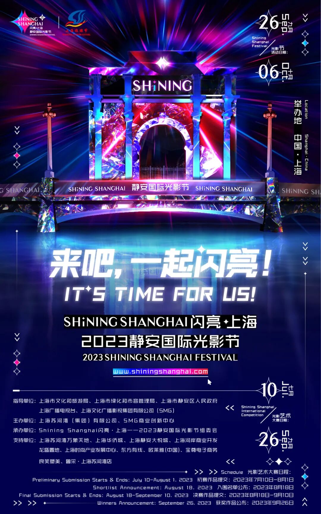 光影所至,城市闪亮。8月18日上午,Shining Shanghai 闪亮·上海 2023静安国际光影节正式启动发布。作为上海旅游节重点推介项目,本次光影节活动将以“点亮城市之光、赋能城市更新”为主旨,于9月26日至10月6日期间向公众正式开放。详见↓