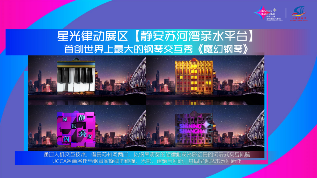 本次光影节将以万象天地慎余里、天后宫、上海总商会、上海大悦城等地标建筑为“点”,演绎多场沉浸式互动光影秀,展现城市艺术魅力。以苏州河景观步道为“线”,串联起时尚潮流、体育休闲、人气美食、音乐游戏等多元共融的光影奇妙夜,满足市民文化需求。以苏河湾滨水地区为“面”,设置“文艺奇遇夜”“虚拟之城”“不焦虑空间”3大主题街区,营造城市活力空间。以静安区文化艺术生态为“体”,打造“演艺新空间、人文新景观、休闲好去处”为一体的文旅新地标,为城市更新与美好生活升级赋能,助推打造上海文旅商贸新品牌。