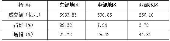 从区域结构看,44家重点监测市场中,东部地区专业市场成交额为5983.83亿元,占到专业市场总成交额的88.38%,东部地区是我国纺织服装行业领先地区,实现了21.73%的稳健增长;中部地区专业市场成交额为530.85亿元,同比增长25.42%,占到专业市场总成交额的7.84%;西部地区专业市场成交额为256.10亿元,占到专业市场总成交额的3.78%,西部地区专业市场成交额此前受疫情影响下跌最为明显,本期也实现了最大幅度的回升,增幅达到44.81%。(三)流通层级结构分析