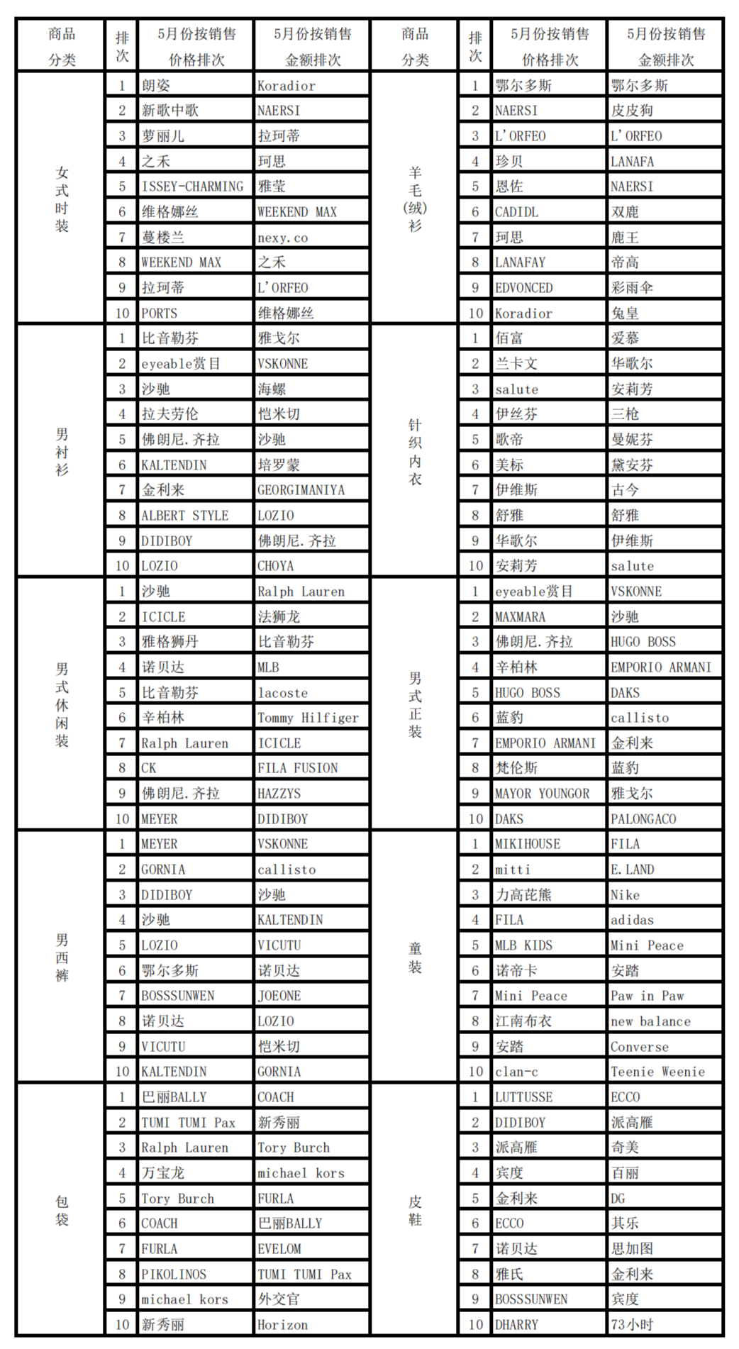 2023年5月份上海服装行业协会网络信息服装商品销售品牌排行榜