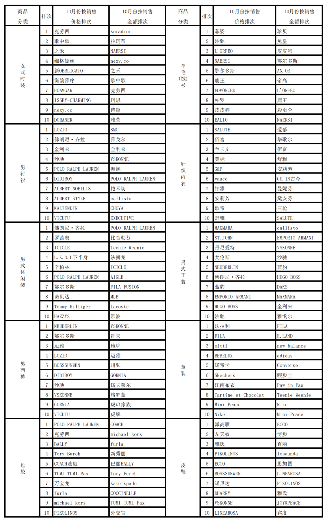 2022年10月上海服装行业协会网络信息服装大类商品销售品牌排行榜