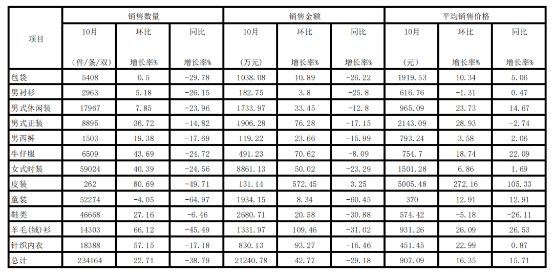 上海服装行业协会网络信息定期统计报表显示,2022年10月份,上海十大商场服装大...