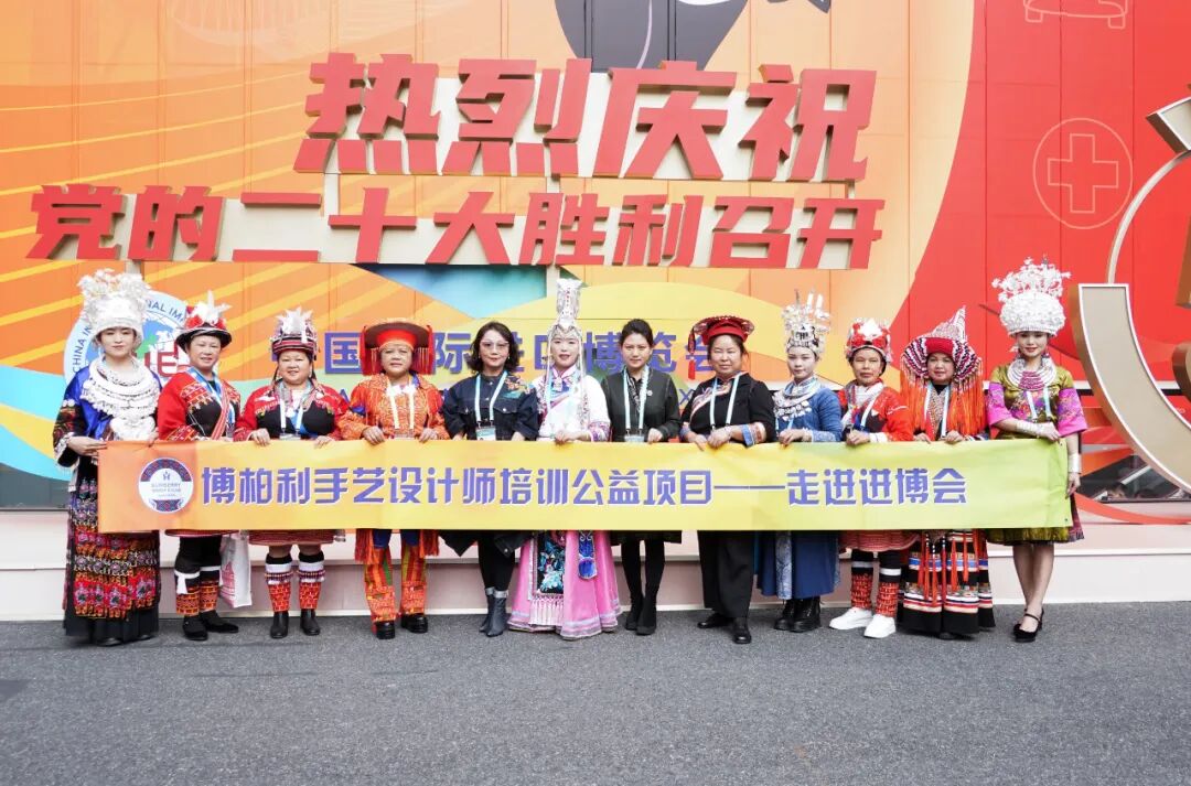 为贯彻落实党的二十大关于推进文化自信自强、铸就社会主义文化新辉煌的重要部署,由中国纺织工业联合会、中国妇女发展基金会共同发起、博柏利集团支持的大型公益项目——博柏利手艺设计师培训公益项目走进第五届中国国际进口博览会。11月6日,身着少数民族盛装的苗族、畲族、瑶族10名学员成为博览会一道靓丽的风景线,在博柏利展位中的学员作品更是吸引了参观者的眼球。中国纺联原副会长、中国十大非遗人物孙淮滨,中国纺联上海办事处主任蒋伟文,中国纺联非遗办副主任陆茵,博柏利中国区总裁张允馨,中国纺织非遗推广大使、项目公益大使、金顶奖设计师刘薇,上海纺织协会常务副会长刘寅峰,东华大学教授、上海纺织服饰博物馆馆长卞向阳,世界自然基金会主任任文伟等领导嘉宾,以及来自2022年度培训后的三期苗族、畲族、瑶族10名优秀学员代表共同出席了进博会系列交流活动。作为项目发起方代表,孙淮滨在讲话时表示,进愽会是国家提高对外开放水平的高端平台,博柏利集团积极参展并将手艺设计师公益项目成果呈现融入,表明博柏利对中国女性就业和纺织非遗事业的支持和信心。作为2022年该项目的参与者,深感手艺与设计对接是符合纺织非遗产品市场化发展的需要。此次进博会公益行动更是意义非凡,希望学员不仅能够利用进博会平台,增长见识,开阔眼界,同时还应该在交流学习的过程中,了解市场动态和需求,为设计、生产适销对路的非遗产品打开思路,从而助力传统工艺的高质量发展,彰显中华文化魅力。张允馨总裁在致辞中提到,近年来博柏利集团在中国市场一直延续热心公益的传统,积极履行企业社会责任,博柏利手艺设计师培训公益项目实施一年来,已针对苗、畲、瑶三个少数民族60名女性学员开展了培训,取得了良好的社会反响,接下来,博柏利集团将继续全力支持项目实施,为更多的女性非遗手艺人点亮梦想,助力前行。在活动中,项目公益大使、培训导师刘薇以图文、视频形式对三期培训所取得的成果做了详细介绍,最让她感到欣慰的是通过学员交流座谈会看到学员们的变化以及在设计和审美能力上得到明显提升。活动现场,10名优秀培训学员身着民族盛装,活态展示苗、畲、瑶族的纺织非遗技艺,现场的非遗转化成果作品兼具艺术性与实用性,拉近了与现代时尚生活的距离,令观众耳目一新,爱不释手。学员们在畅谈对产品包装、构图、配色等方面的创新尝试时,都非常兴奋的表达自己的可喜收获。