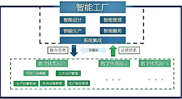 2016年我国工信部对什么是智能制造曾经下了这样的定义:“智能制造是基于新一代信息通信技术与先进制造技术深度融合,贯穿于设计、生产、管理、服务等制造活动的各个环节,具有自感知、自学习、自决策、自执行、自适应等功能的新型生产方式”。从这个定义可知,首先,对一个制造企业来说,要转型于智能制造工厂,必须要将新一代信息通信技术与先进制造技术深度融合,这意味着智能制造工厂是要建立在所有车间数字化基础上的;其次,所有业务必须智能化,只有智能设计、智能生产、智能管理、智能服务等业务等实现了,才有可能做到具有自感知、自学习、自决策、自执行、自适应的智能制造工厂,见图一。
