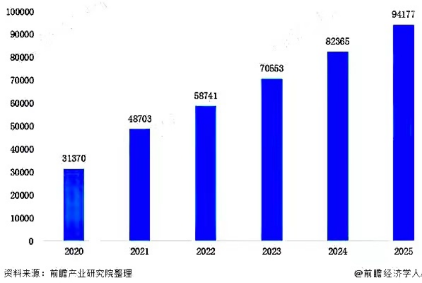 大家一定记得,我国国务院已经连续五年在政府工作报告中提出要发展工业互联网的要求:2018年,政府工作报告中首次提出要“发展工业互联网平台”;2019年提出要“打造工业互联网平台,拓展‘智能+’,为制造业转型升级赋能”;2020年提出要“发展工业互联网,推进智能制造”;2021年提出要“发展工业互联网,搭建更多共性技术研发平台,提升中小微企业创新能力和专业化水平”;2022年提出要“加快发展工业互联网,培育壮大集成电路、人工智能等数字产业,提升关键软硬件技术创新和供给能力”。在国家如此重视之下,中国工业互联网及其平台进入了快速发展阶段。工业互联网是在互联网基础上发展起来的,最早提出工业互联网定义是美国GE公司,GE公司在2012年11月26日发布的白皮书中是这样定义工业互联网的,“工业互联网是打破智能与机器的边界”,它的这个定义非常深刻,把工业革命和互联网革命中的成果相融合在一起,说明了工业互联网要解决的问题是工业革命的成果带来的无数的机器、设施、机群和系统网络(全球工业系统)的运行效率的提升和运行成本的降低;解决这个问题的手段是互联网革命中涌现出的先进计算、分析、低成本传感、控制软件和互联网带来的新水准的连接能力;解决这个问题的途径是连接,汇合,汇聚(融合)。后来GE公司为了推广工业互联网,于2014年成立了世界上推广工业互联网的最大组织Industrial Internet Consortium,缩写为IIC,IIC工业互联网把GE工业互联网向前推进了一步,就成为今天大家所熟悉的工业物联网IoT。2016年,我国参考了GE工业互联网和ICC工业互联网定义之后,也对工业互联网进行了定义,但我们的定义有两个:一个是由2016年2月成立的中国工业互联网产业联盟(简称AII)作出的,AII的工业互联网定义:工业互联网是新一代信息通讯技术与工业经济深度融合下的关键基础设施、新型应用模式和全新工业生态。工业互联网通过人、机、物的全面互联,实现全要素、全产业链、全价值链的全面连接,将推动形成全新的工业生产制造和服务体系;另一个是由中国工业互联网研究院作出的工业互联网定义:工业互联网是新一代网络信息技术与制造业深度融合的产物,是实现产业数字化、网络化、智能化发展的重要基础设施,通过人、机、物的全面互联,全要素、全产业链、全价值链的全面链接,推动形成全新的工业生产制造和服务体系,成为工业经济转型升级的关键依托、重要途径、全新生态。可见,我国工业物联网的定义赋予了“工业互联网”全新的含义,其内涵扩展的较大。工业互联网是由网络、平台、安全三个部分构成。其中,工业互联网平台是工业互联网的核心,平台是制造业全要素、全产业链、全价值链的全面连接、汇聚、配置的枢纽。工业互联网平台最大作用是:①能够解决智能化生产,提升生产效率,提高产品的质量,降低生产的成本;②可以做网络化协同,众创协同设计,协同制造;③个性化定制;④服务化延伸。鉴于此,工业互联网平台便成为制造业转型于智能制造的重要抓手。根据我国前瞻产业研究院研究,2020年至2025年我国工业互联网产业经济总体规模如图十一所示,2022年产业规模可达5.874万亿元。
