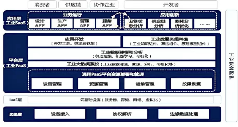据工信部统计到2021年底,我国工业互联网平台比较有影响力的有100多家,平台汇聚工业APP突破59万个,平台连接的工业设备达到7600万台,平台服务的工业企业达到160万家。“十四五”期间工信部还将实施中小企业数字化促进工程,争取到2022年年底组织100多家工业互联网平台和数字化转型服务商为10万家以上中小企业数字化转型服务,推动10万家中小企业业务“上云”。总体来说,当前工业互联网平台服务架构和容器技术等相对成熟,但边缘计算、产业协同、工业机理模型、高端软件研发、平台安全保障技术等核心技术还亟待攻克求得发展。我们服装行业至今还没有一个真正实用的服装行业级工业互联网平台,几年前我们曾经对打造服装行业级工业互联网平台进行了研究,提出了纺织服装行业级应用平台的架构,见图十二,后因架构的SaaS、PaaS、IaaS以及边缘层建设与研究等种种困难,平台还没有成为现实。