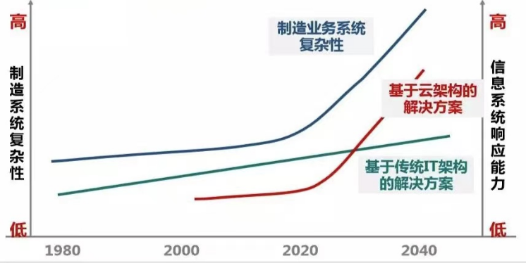 由前面可见服装智能制造系统的确很复杂性,其复杂性不仅来自于相关技术期待发展,还来自于服装产品本身、来自于客户需求、来自于全球化、来自于供应链、来自于世界政治经济环境的变化等等。我们现在正在经历从2020年到2040年的一个历时20年的世界制造业技术架构体系复杂性大变革时代,见图十六。由于制造业业务复杂性,它的复杂性已经不是传统的信息技术所能解决的,随着制造系统复杂性不断提高,信息技术的响应能力也要不断提高,智能制造的复杂性需要智能云端架构的信息系统来解决。