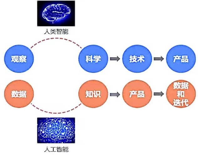 我们未来的时代是智能时代,智能时代是人的认知和以数据为基础的机器认知共存时代,人的认知靠人类大脑,机器的认知靠人工智能。例如,同样要制造一个产品,人靠观察思考以及科学技术获得产品,而机器靠获取数据里的知识和利用数据不断迭代而获得产品,可见数据和知识是一体两面,数据是知识的载体,见图八。