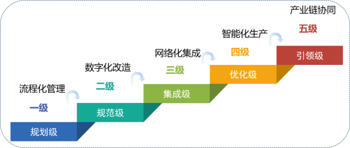 2020年我国发布了《智能制造能力成熟度模型》(简称CMMM)GB/T39116-2020,它描述了企业实施智能制造要达到的阶梯目标和演进路径,是引导企业数智转型工作的标尺。见图三。