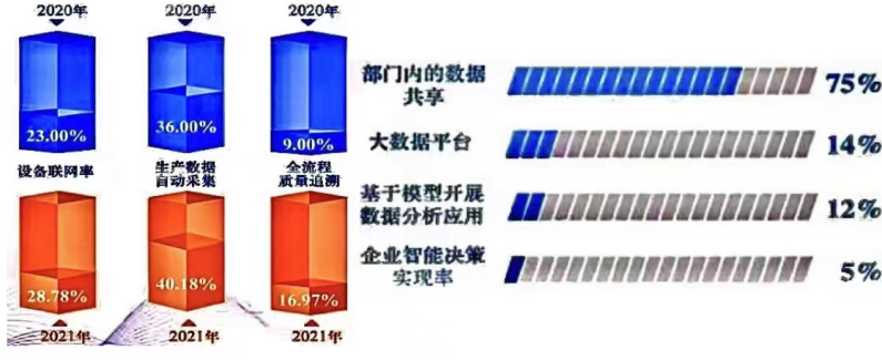 机器靠人工智能就能认知,我们把这样的机器就叫做智能机器,在智能制造中我们要使智能机器会听(例如语音识别、机器翻译等)、会看(例如机器视觉、图像识别、文字识别等)、会说(例如语音合成、人机对话等)、会思考(例如人机对弈、决策及定理证明等)、会学习(例如机器学习、深度学习、知识表示等)、会行动(例如机器人、自动驾驶汽车)等等。我曾经多次说过没有大数据就没有人工智能、没有人工智能就没有智能制造,可见大数据技术和人工智能技术对智能制造是多么重要,那么我们现在的大数据技术和人工智能技术发展如何呢?人工智能有三要素,大数据、算法、算力。这三者算力在于数据中心的建设及投入,关键在于大数据和算法模型及算法。2021年我国制造业大数据采集与应用情况并不见好,企业自动数据采集只达到40.18%,企业内部各部门间共享数据只达到75%,能应用大数据平台的只有14%,对基于模型开展大数据应用分析的只有12%,能够利用大数据进行智能决策的只有5%,见图九。