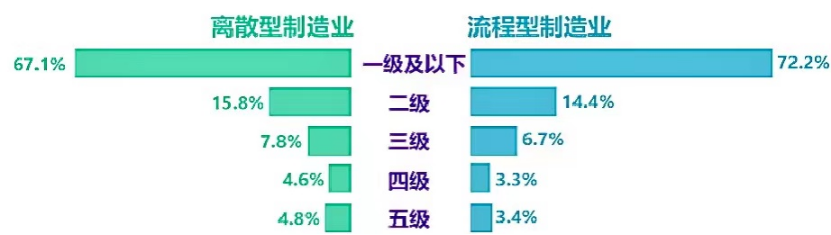 目前除了“全球灯塔工厂”作为智能制造工厂的示范工厂之外,我国制造业尤其是我国服装制造业绝大多数对标智能制造能力成熟度模型,还都处在规范级和集成级之间,也就是说处在数字化改造和网络化集成之间,距离优化级和引领级还远着呢。据赛西数智化转型调查,2021年我国智能制造离散型和流程型企业达到的智能制造成熟度级别水平占比如下,见图四。