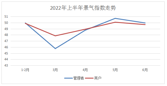 景气方面,2022年上半年,纺织服装专业市场管理者景气与商户景气走势基本一致。管理者景气平均指数为49.02,商户景气平均指数为49.28,均低于50荣枯线,可见上半年专业市场运管理者与商户的营信心整体不足,景气指数偏低。