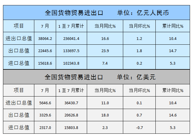 7月,纺织服装出口2241.2亿元,增长23.6%,环比增长6.5%,其中纺织品出口916.4亿元,增长22.1%,环比增长1.8%,服装出口1324.8亿元,增长24.6%,环比增长10%。
